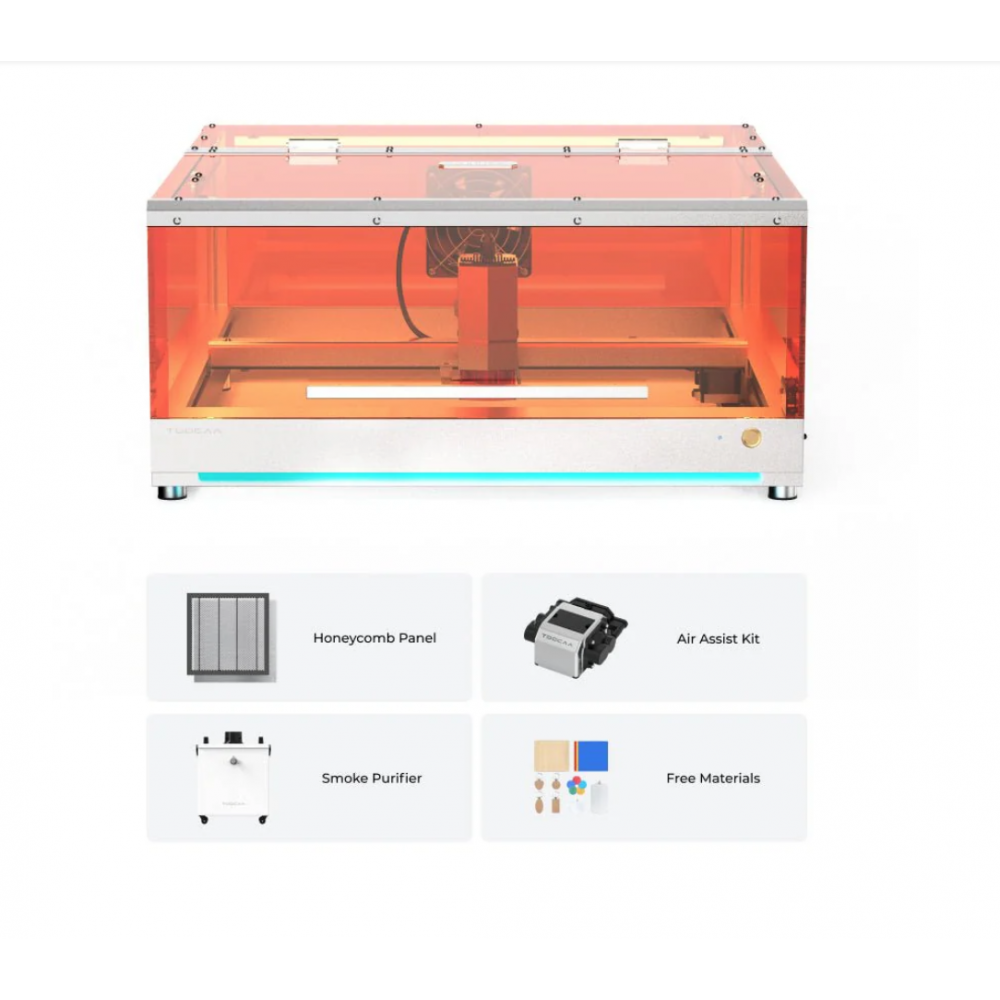 Con este completo pack, que incluye la cortadora grabadora láser TOOCAA de 20W, el asistente de aire, la placa de trabajo de nido de abeja y el purificador de aire, no solo conseguirás unos resultados óptimos, además conseguirás un ambiente de trabajo más saludable.