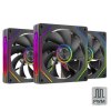 Este kit se compone de un ventilador con aspas estándar y otro con **reverse blade (aspas invertidas)**, ofreciendo flexibilidad para gestionar el flujo de aire en configuraciones push/pull sin perder la estética. Ambos ventiladores cuentan con un espectacular sistema de iluminación **ARGB de doble anillo con efecto 360°**, ideal para configuraciones visibles a través de panel lateral de cristal.